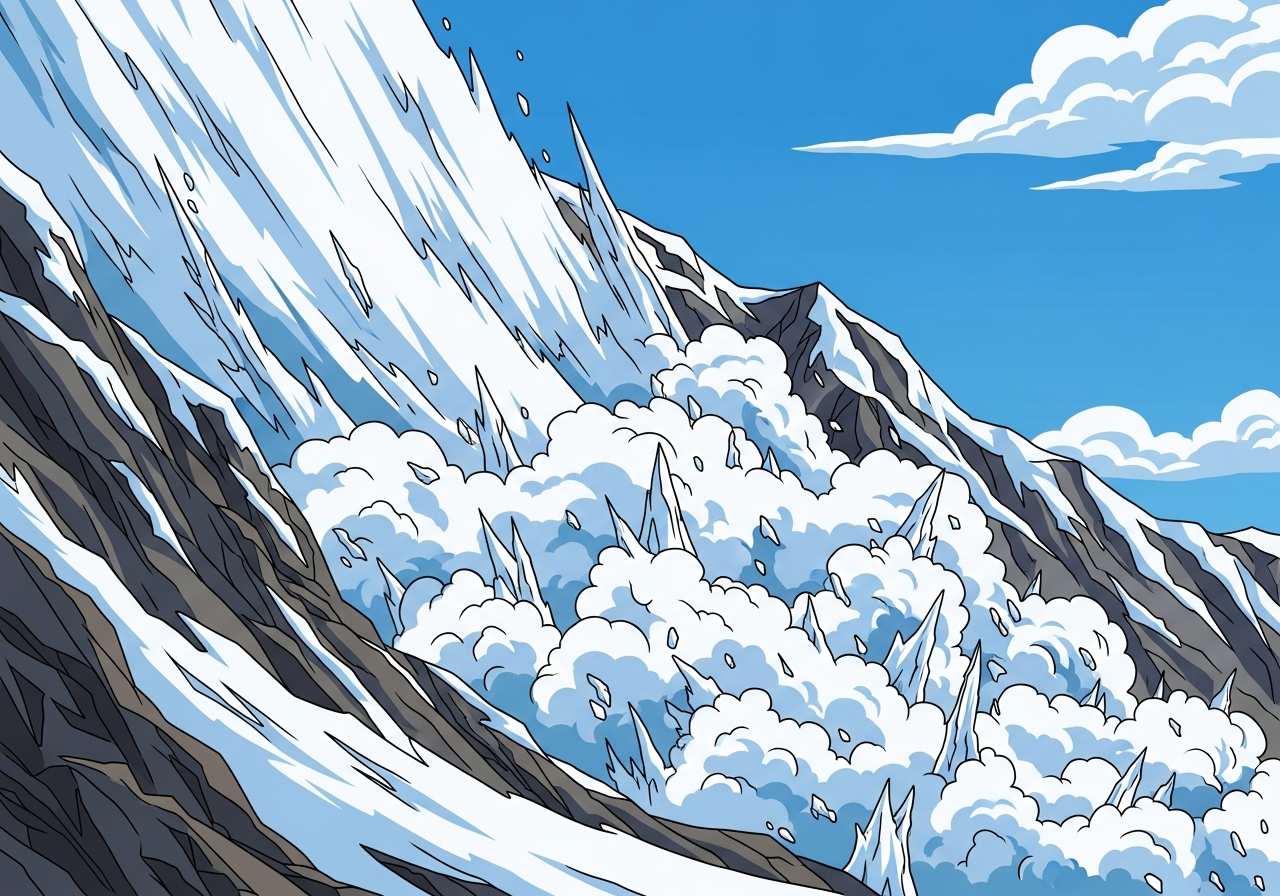 山の斜面から大量の雪や氷が急速に滑り落ちる現象。比喩的に、物事が一気に押し寄せる状況を表すこともある。