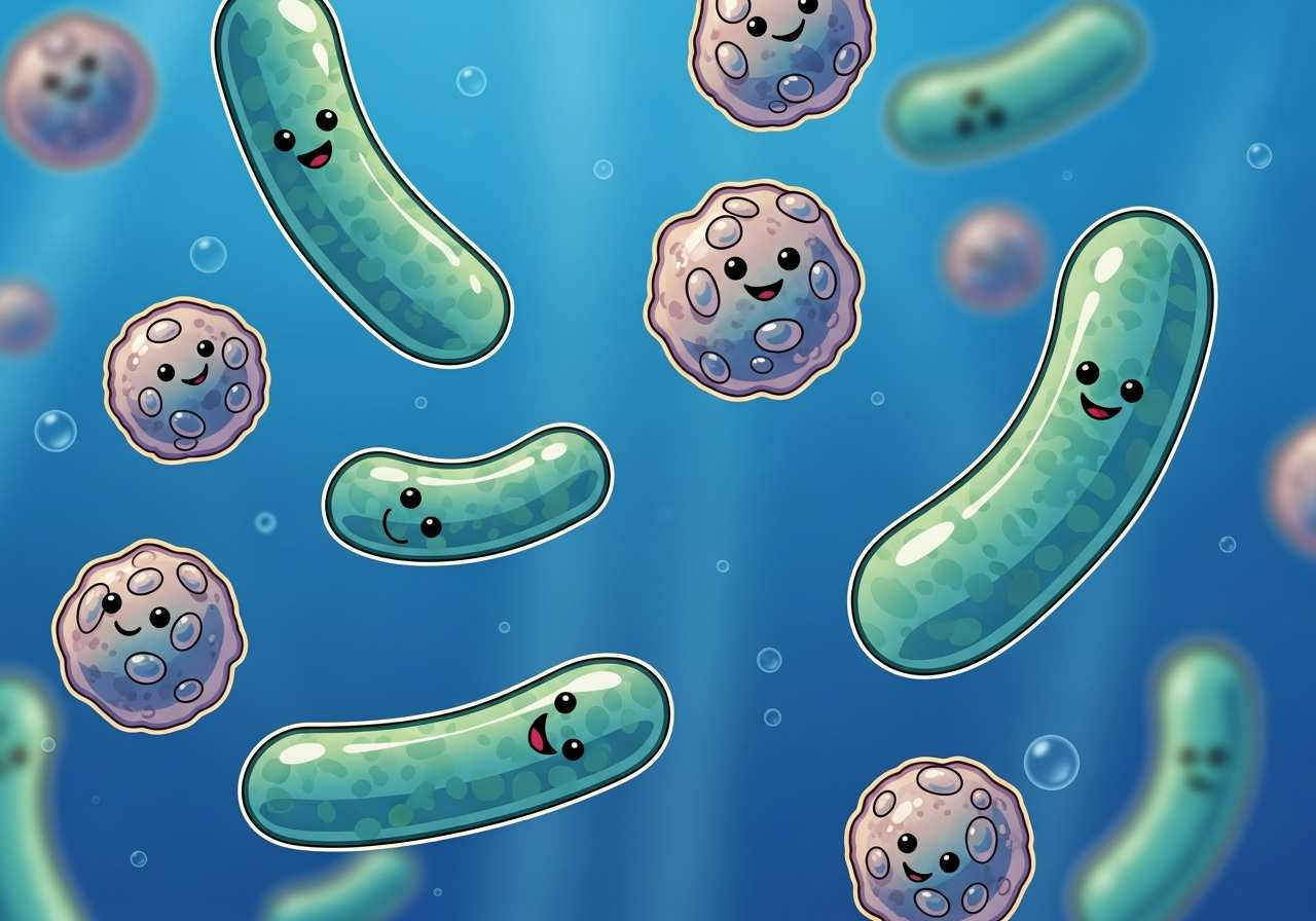 単細胞の微生物で、様々な環境に存在し、有益なものも有害なものもある。専門用語として使用される中立的な表現。