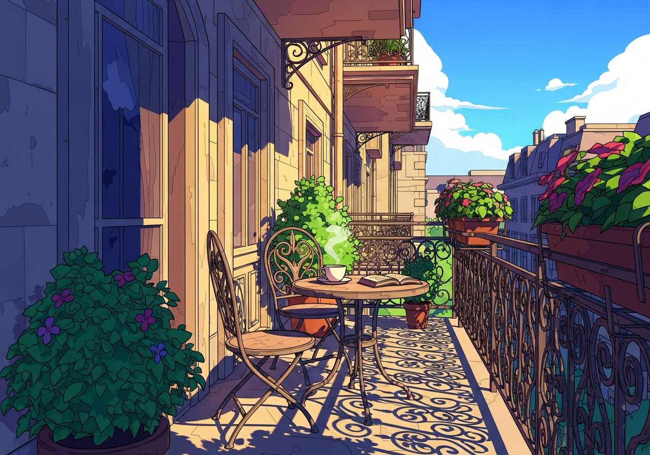 建物の外壁から突き出た、手すり付きの屋外スペース。通常、上階に設置され、外の景色を楽しんだり、くつろいだりするために使われます。