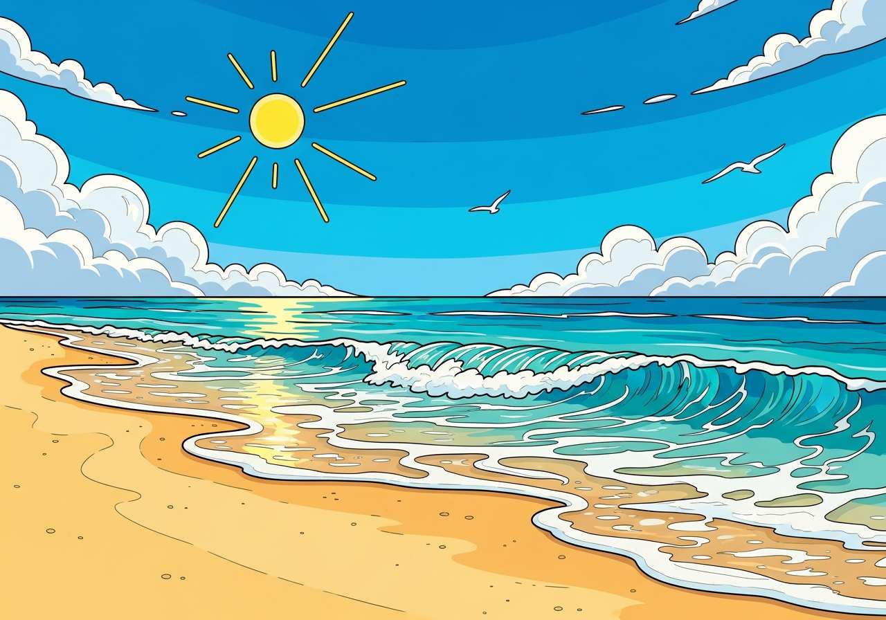 海や湖の岸辺にある砂や小石で覆われた平らな場所。人々が泳いだり日光浴をしたりする場所として使われることが多い。
