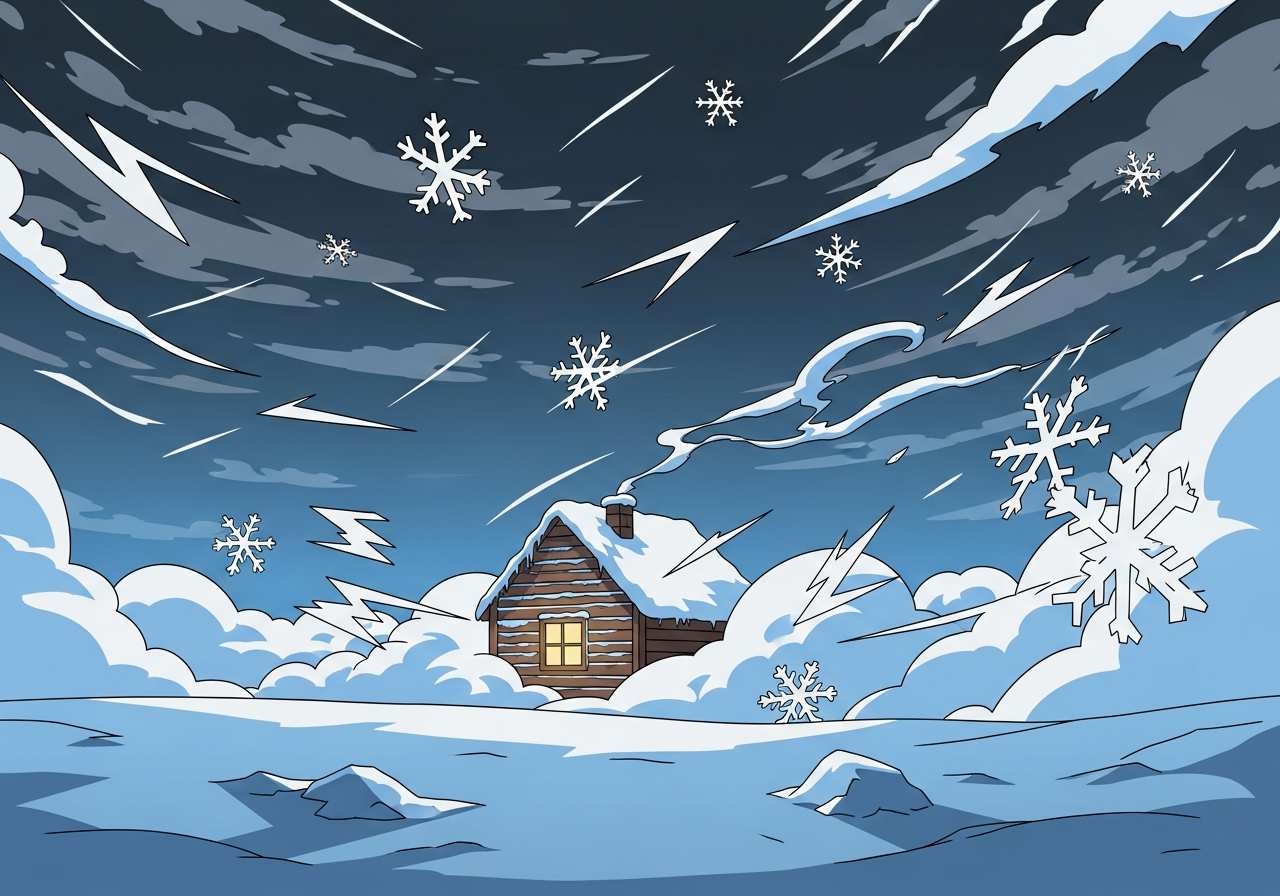 激しい吹雪や暴風雪を表す名詞。視界が悪くなるほどの強風と大雪を伴う危険な気象現象を指します。