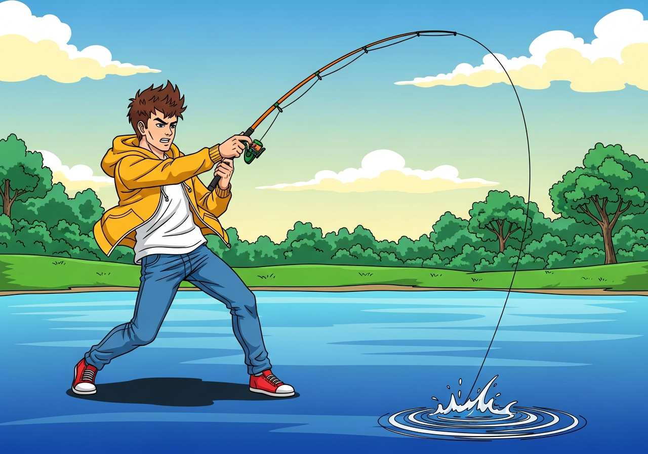 完璧な投げで、彼は釣り糸を湖の遠くまで送り込んだ。