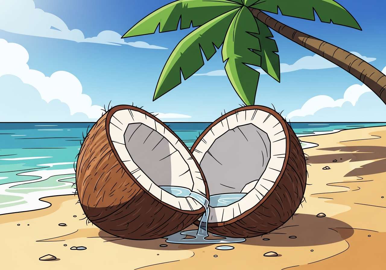 ココナッツは、熱帯地域で育つヤシの木の実です。硬い殻の中に白い果肉と甘い液体(ココナッツウォーター)が入っています。