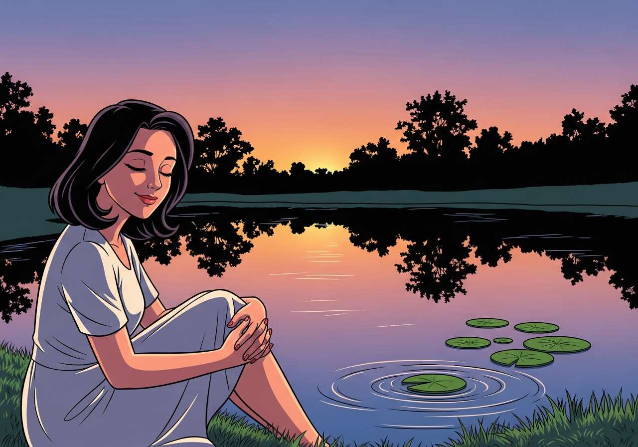 彼女は静かに瞑想にふけり、人生の意味について深く考えていた。