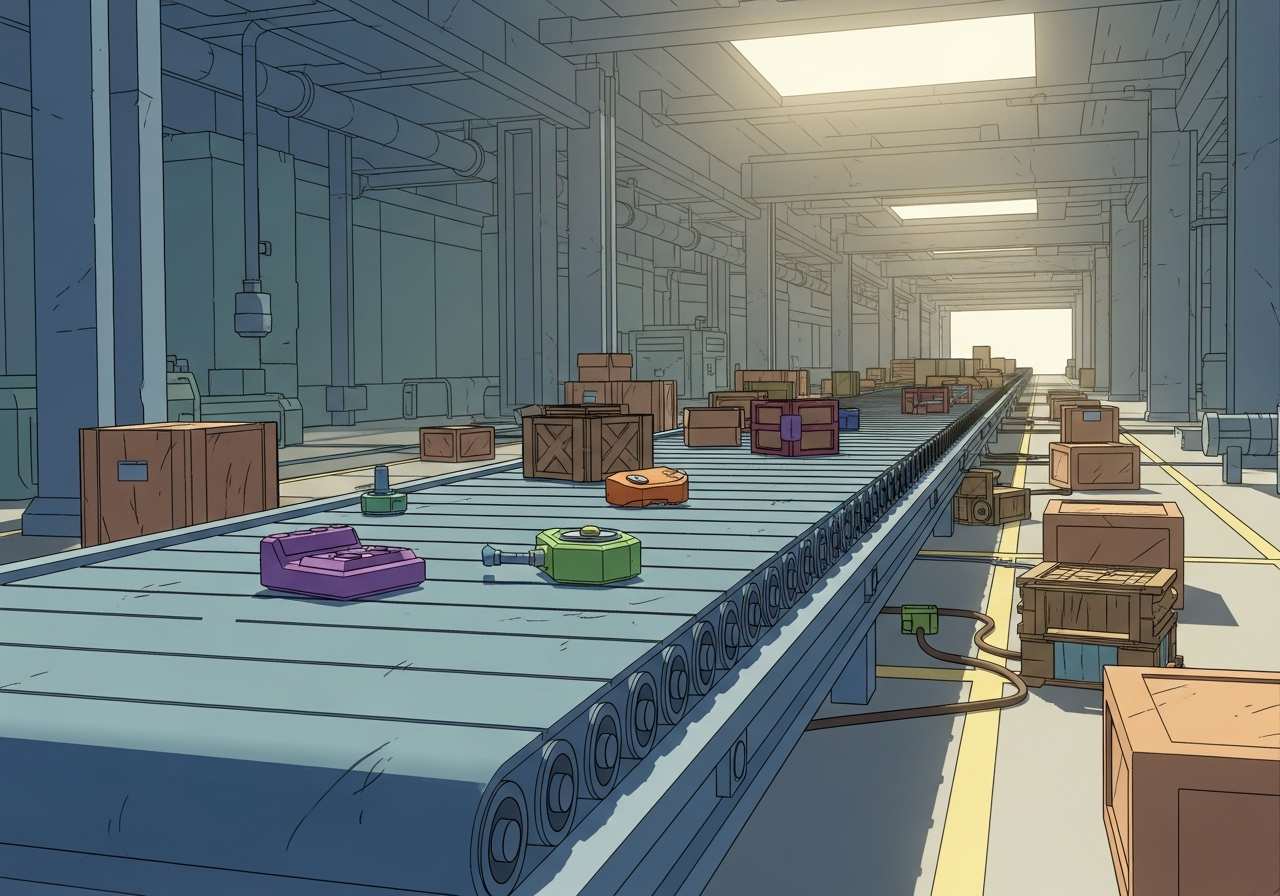 その工場では、組立ラインに沿って製品を移動させるためにコンベヤーを使用している。