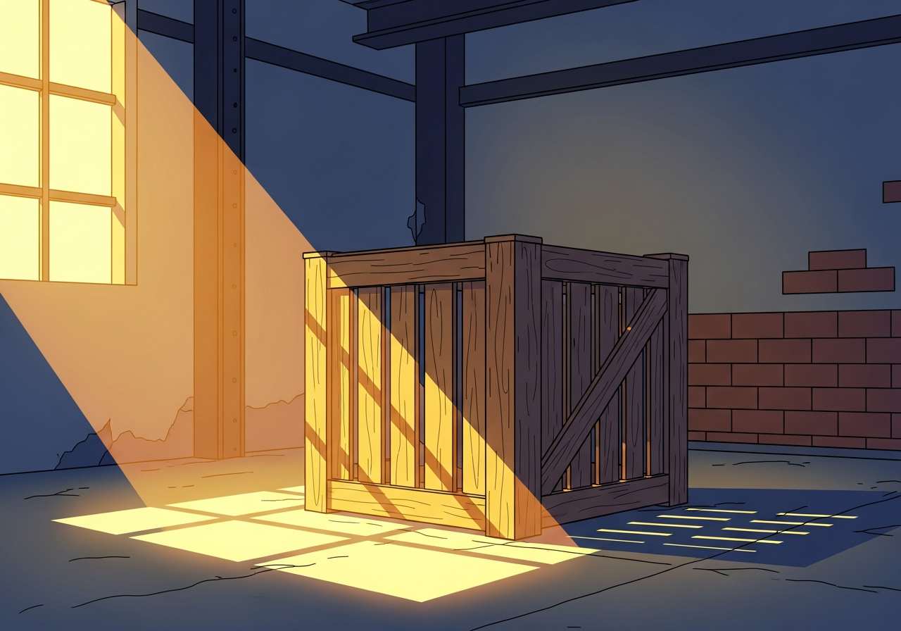 木や金属で作られた、物を運搬・保管するための大きな箱や容器。果物、瓶、機械部品などの輸送に使われます。