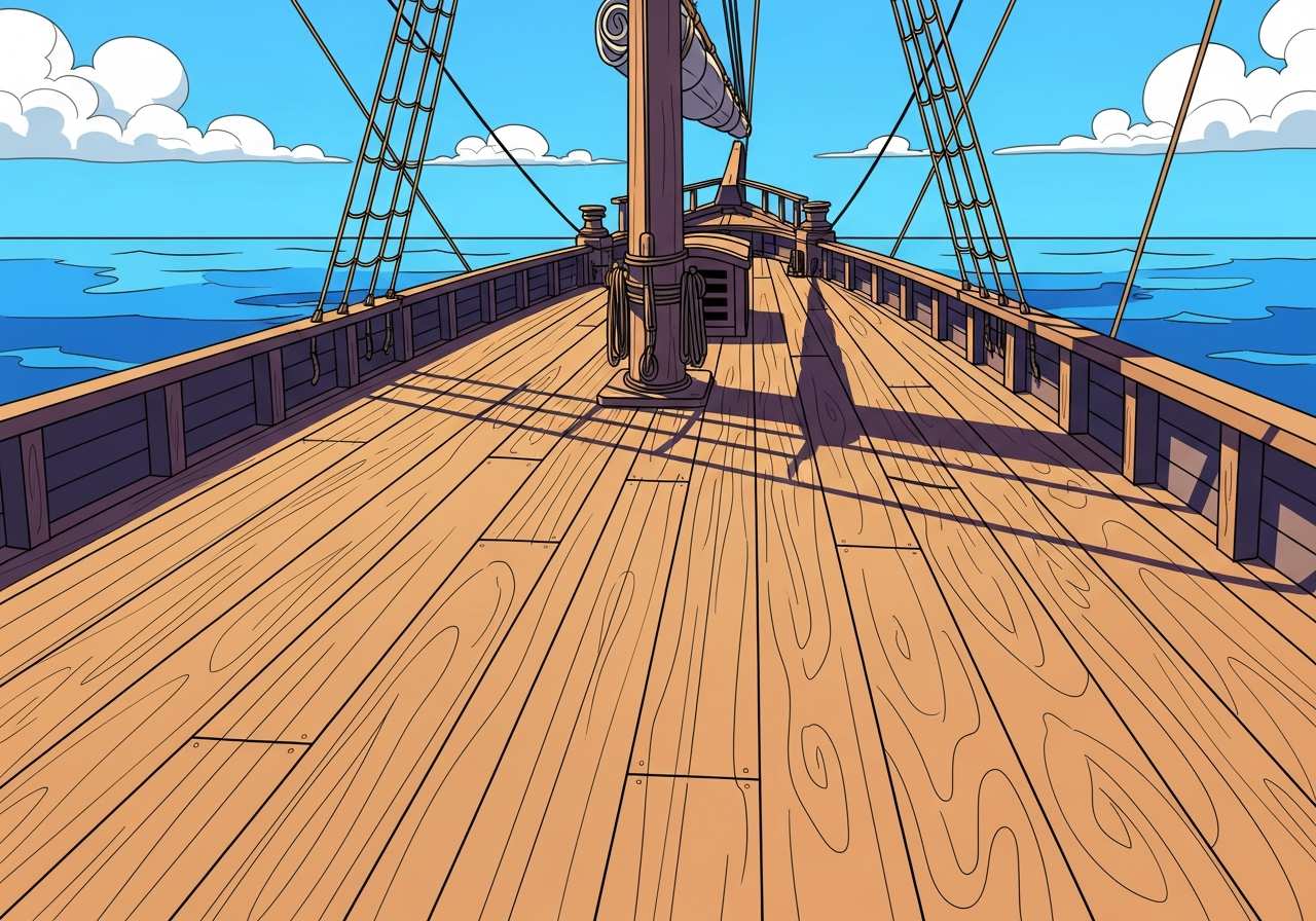 「デッキ」は船の床面や建物の屋外床面を指す名詞です。また、トランプの一組という意味でも使われます。