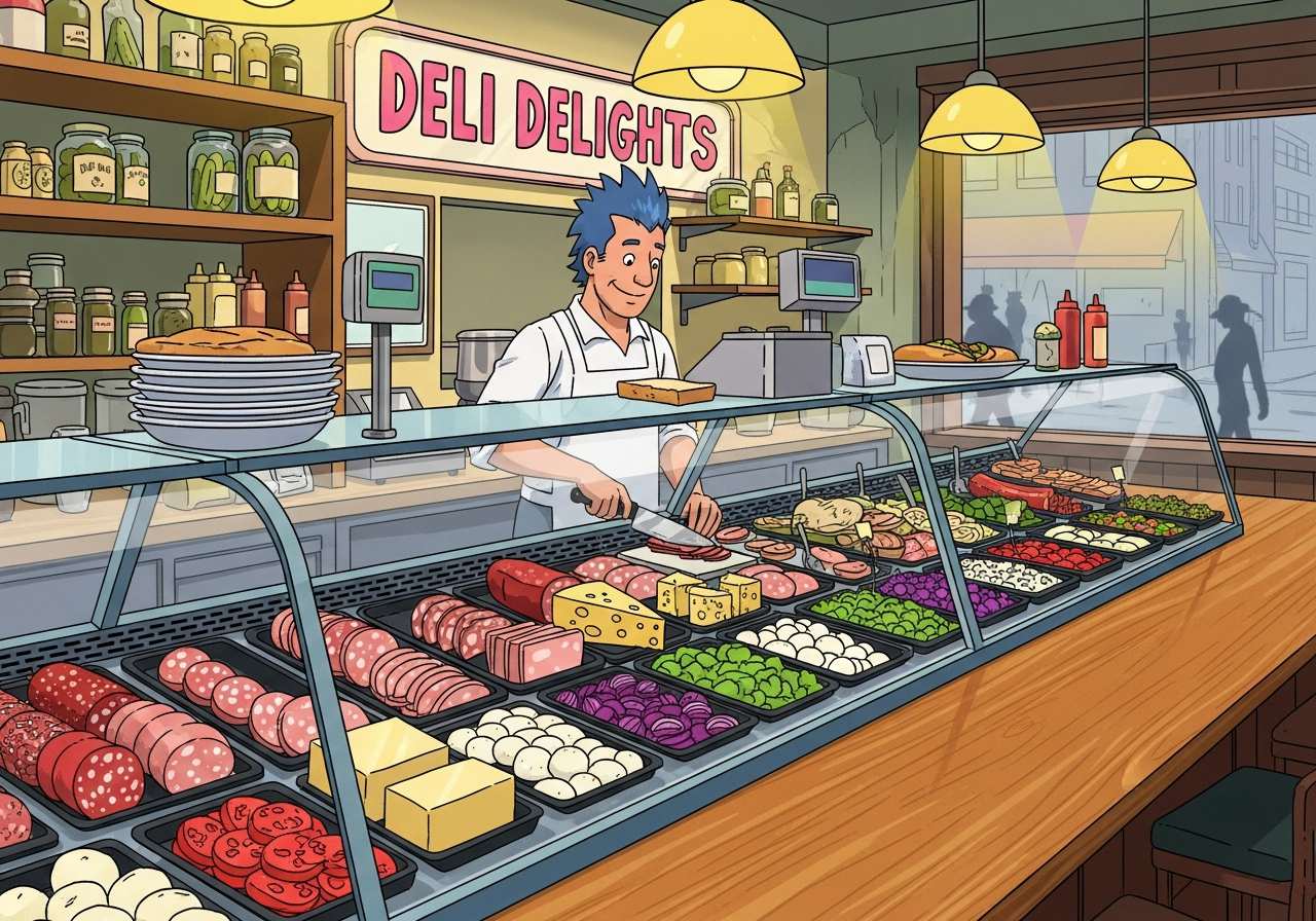 惣菜や軽食を販売する小さな食料品店。サンドイッチやサラダなどを提供することが多い。