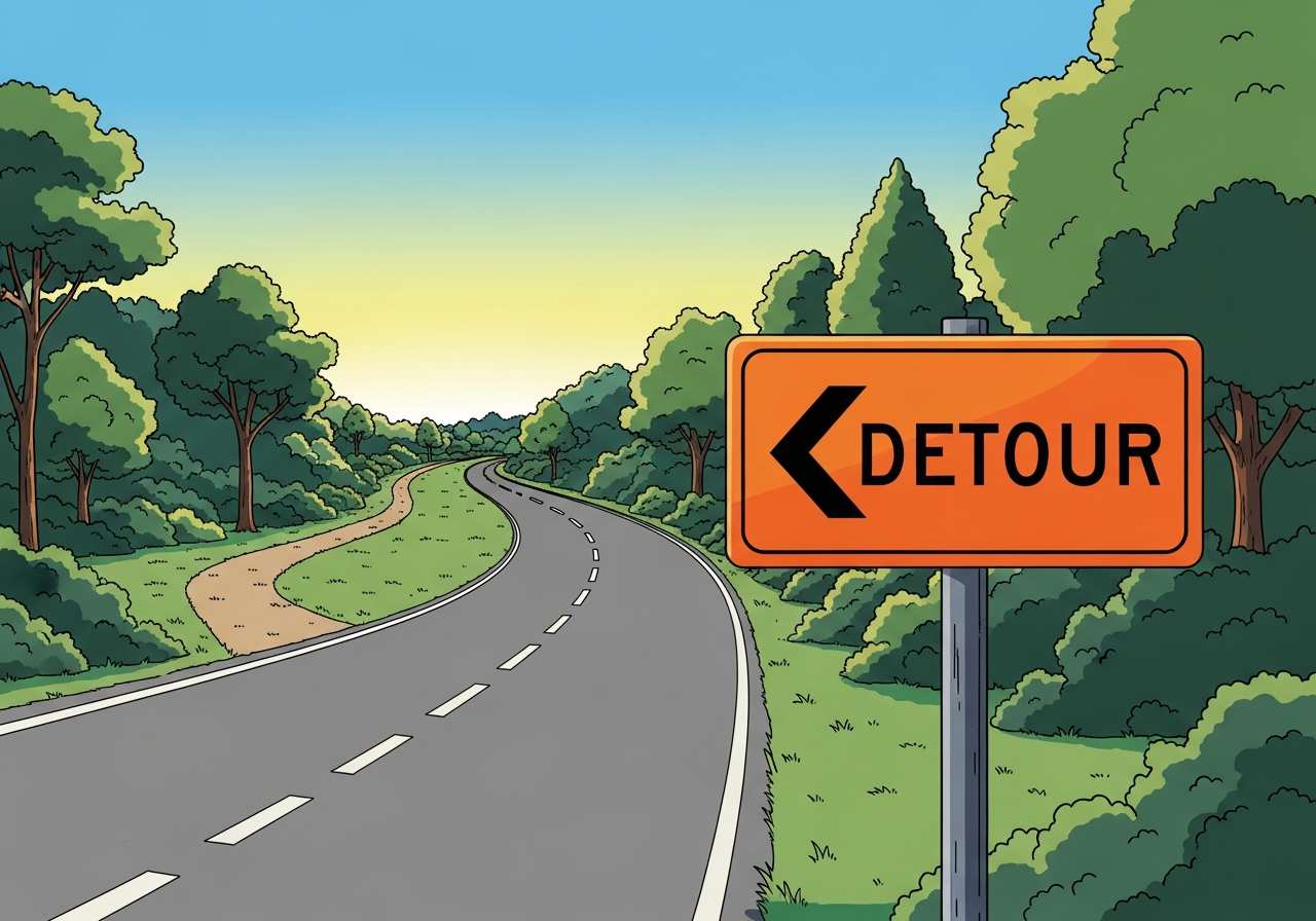 通常のルートを避けて、別の道を通ること。道路工事や交通渋滞を避ける際によく使われます。