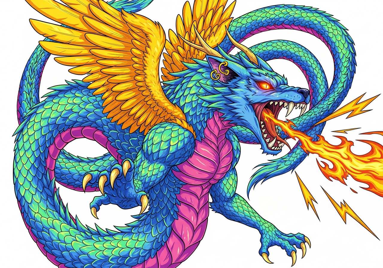 神話や伝説に登場する、翼を持ち火を吐く巨大な爬虫類のような想像上の生き物。多くの文化で力や知恵の象徴とされています。