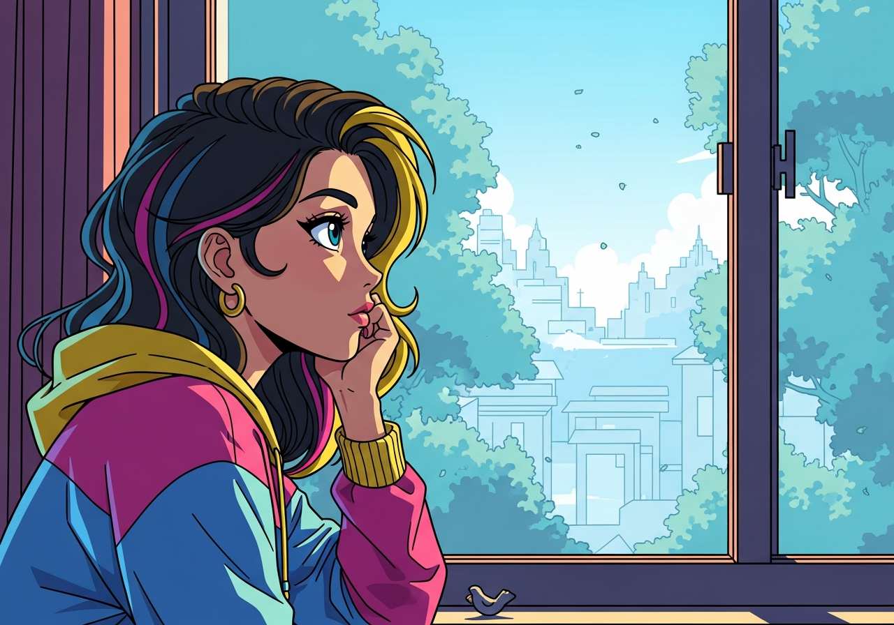 彼女は窓の外を見つめながら、ぼんやりとした表情を浮かべていた。