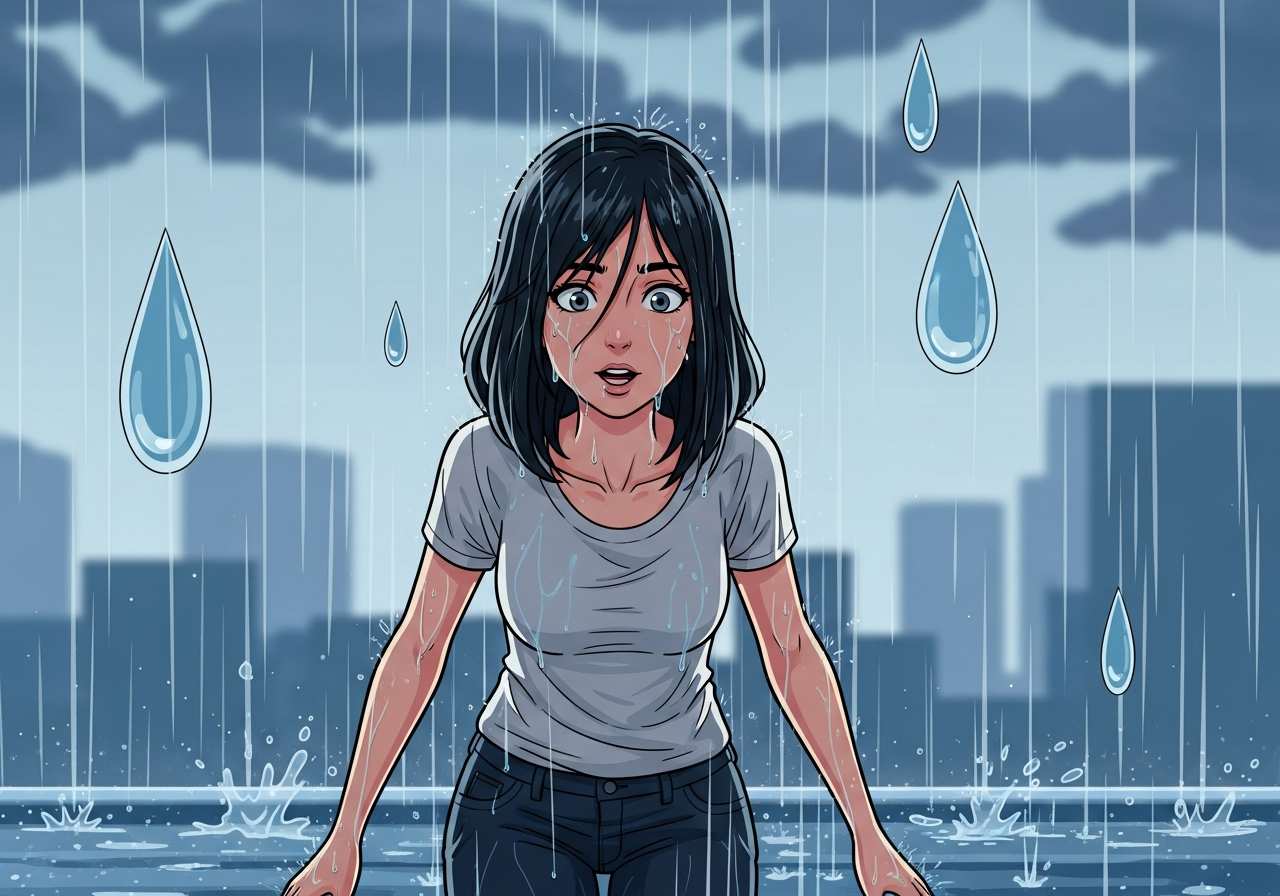 The sudden rainstorm drenched us completely.