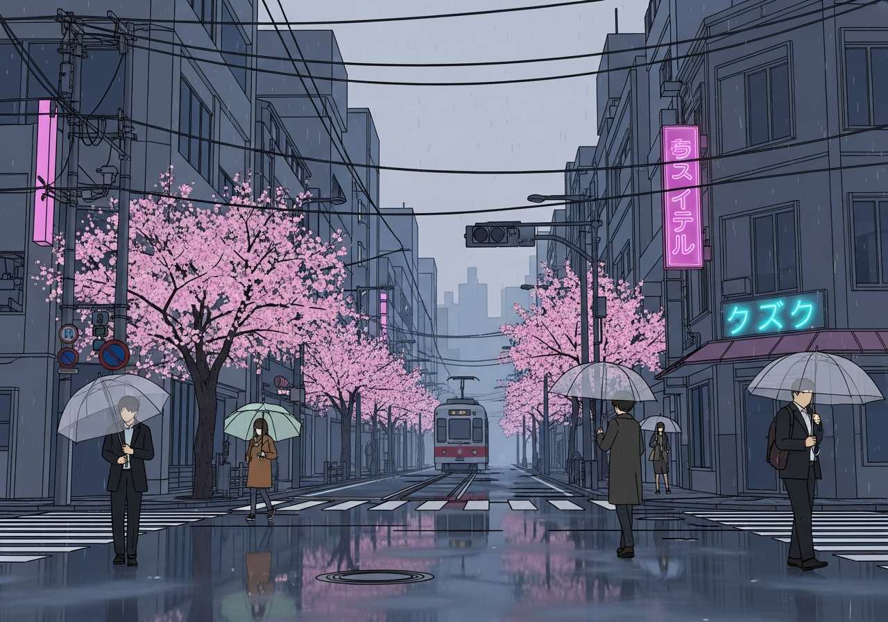 私たちが家を出ると、霧雨が降り始めた。