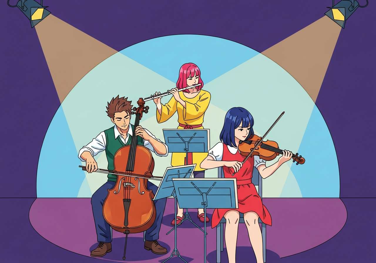 音楽や演劇で一緒に演奏・演技するグループ、または調和のとれた服装の組み合わせを指します。