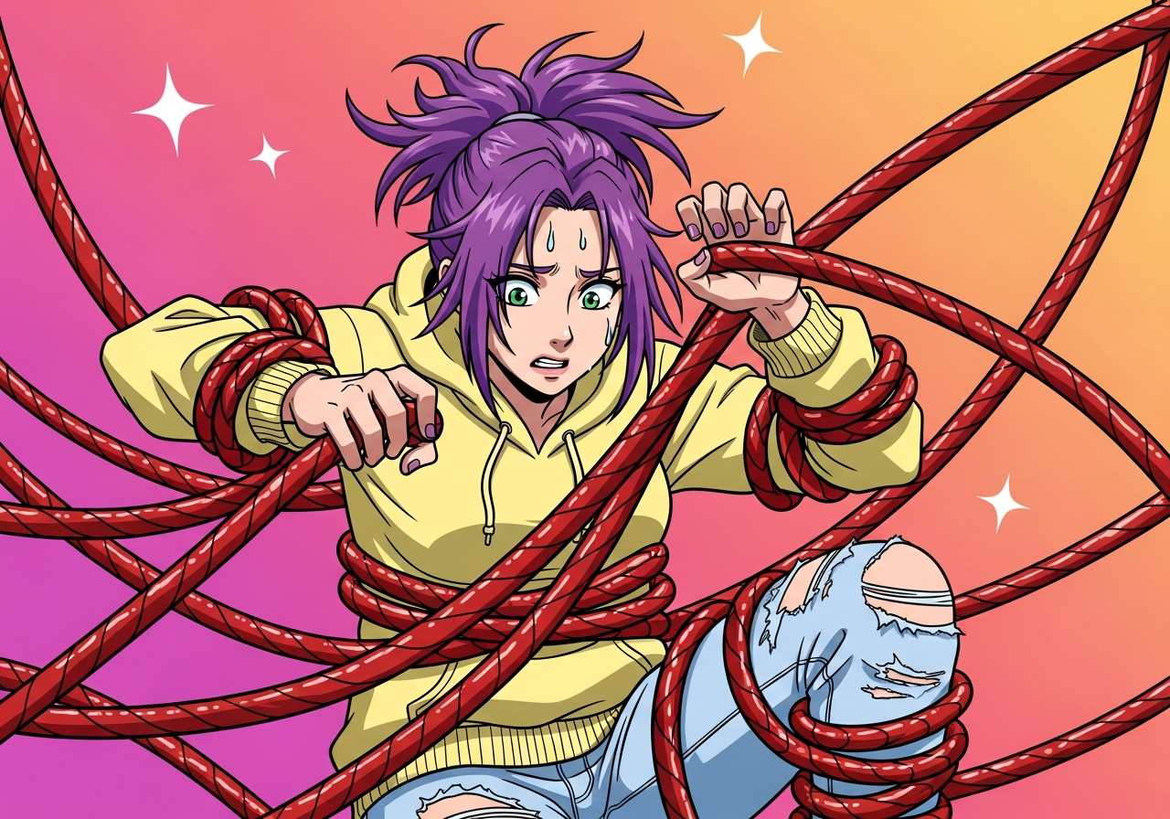 物や人が絡まる、または複雑な状況に巻き込まれることを表す動詞。物理的な絡まりと比喩的な関わりの両方に使われます。