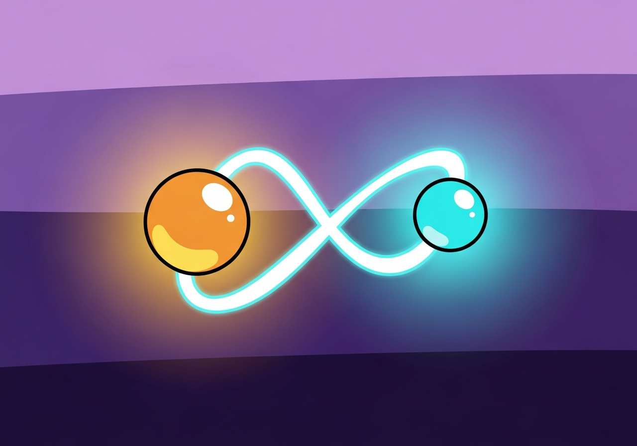 量子もつれ(物理学において、粒子同士が相互に関連し、距離に関係なく一方の状態が他方に瞬時に影響を与える量子力学的現象)