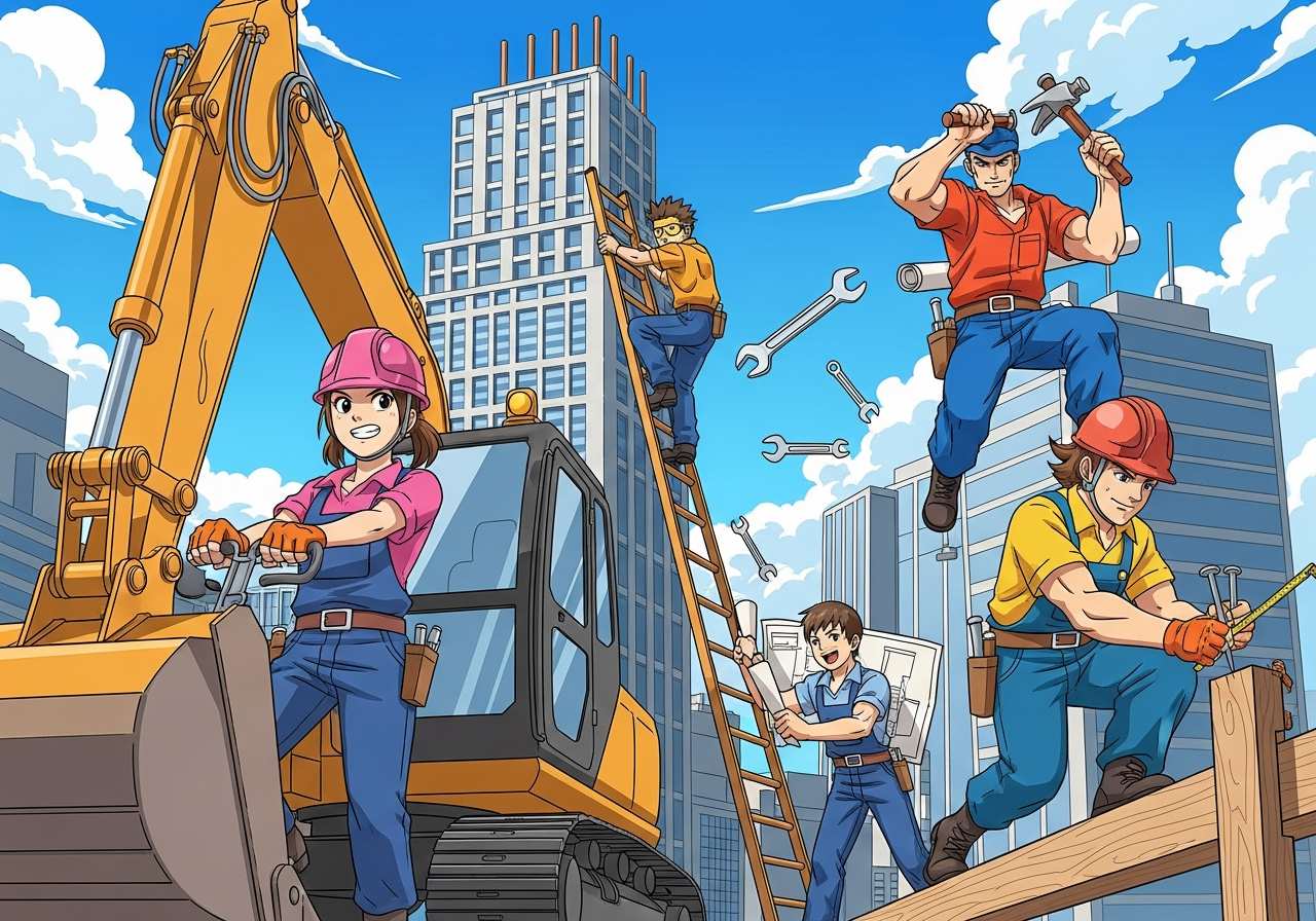直立した、まっすぐに立った状態を表す形容詞。また、建物や構造物を建てる、設立するという動詞としても使われます。