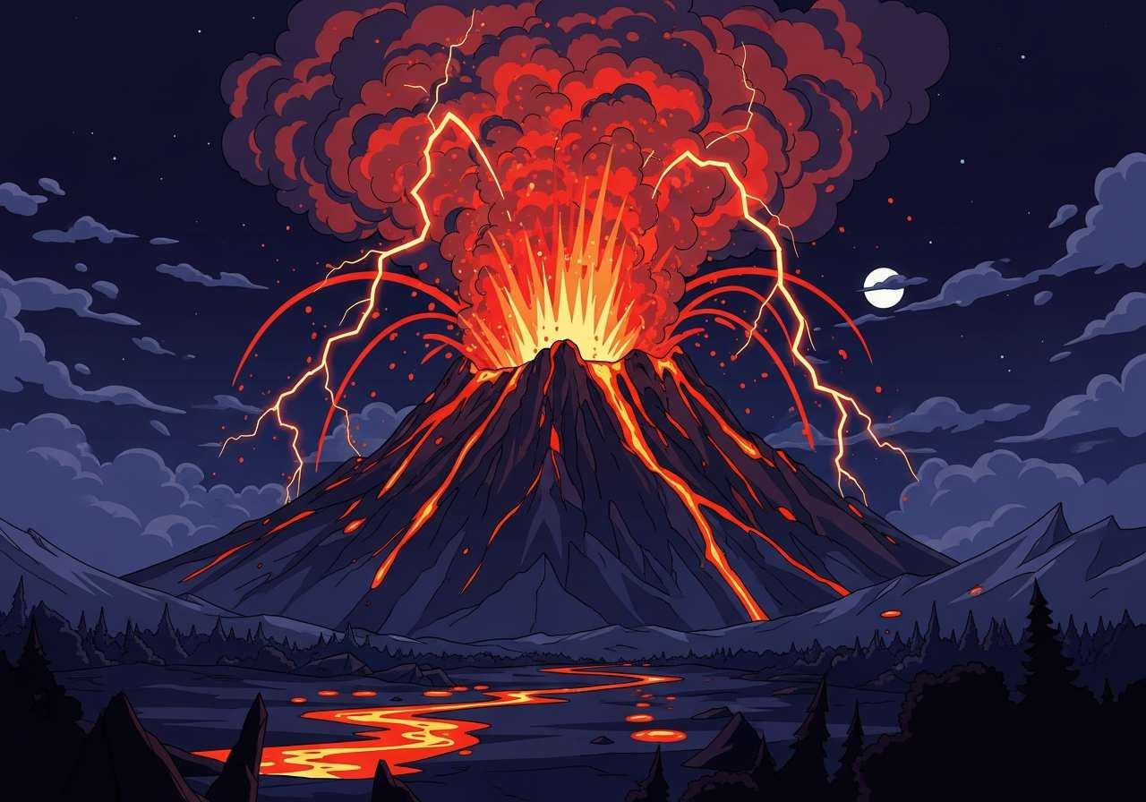 火山が噴火する、または感情が突然爆発することを表す動詞。