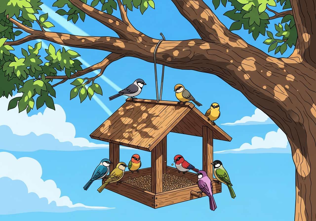野鳥を呼び寄せるために、庭に鳥の餌入れを吊るしました。