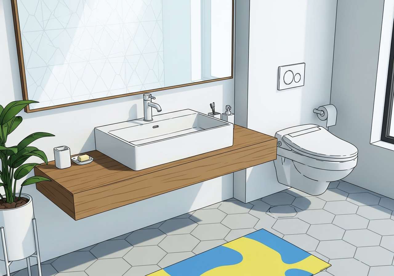 The bathroom fixtures include a sink, toilet, and shower.