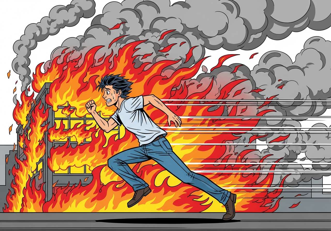 危険や脅威から急いで逃げること。通常、恐怖や緊急性を伴う状況で使われます。