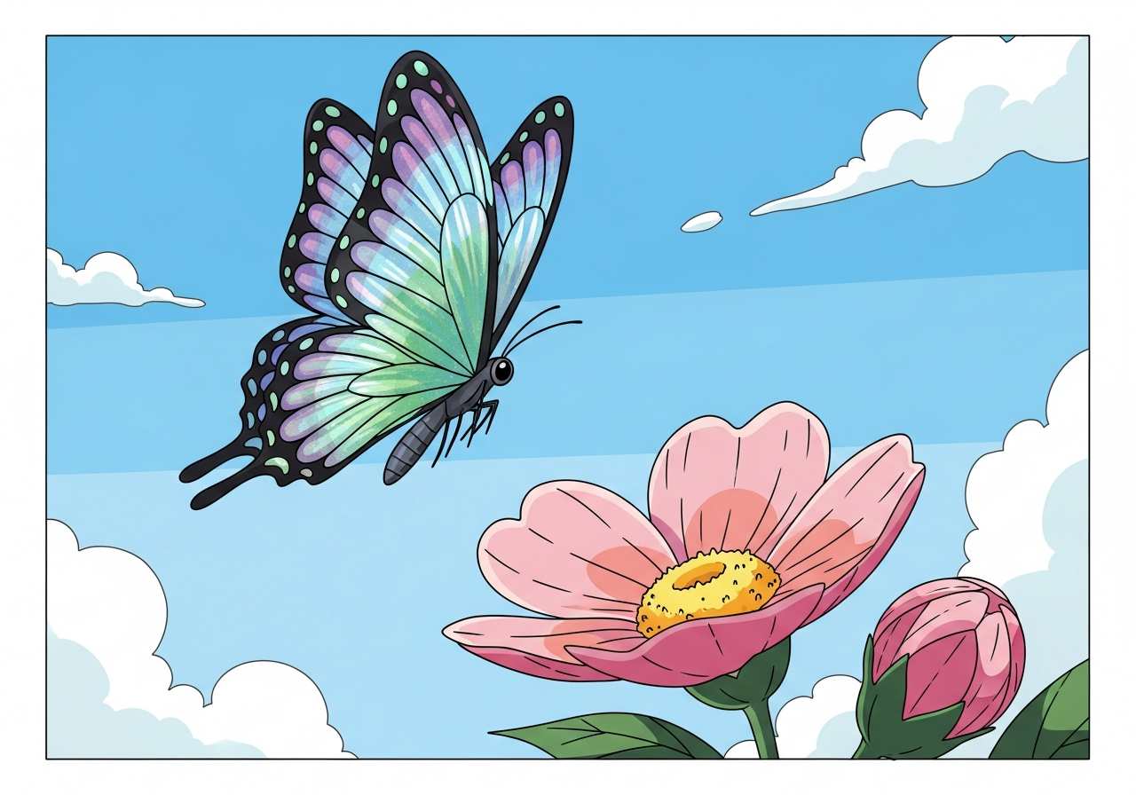 蝶が庭の花から花へとひらひらと飛んでいった。