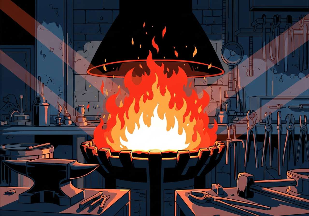 金属を加熱して形を作る場所(鍛冶場)、または金属を鍛える行為を指します。比喩的に「築き上げる」「偽造する」という意味でも使われます。