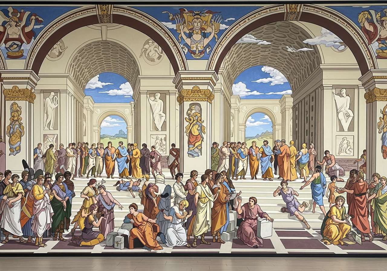 フレスコ画(湿った漆喰に顔料を塗り、色彩を壁と一体化させる壁画技法)