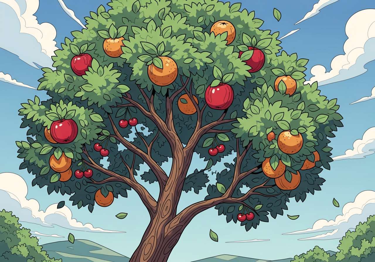 The fruitful apple tree in our garden produces hundreds of apples every year.