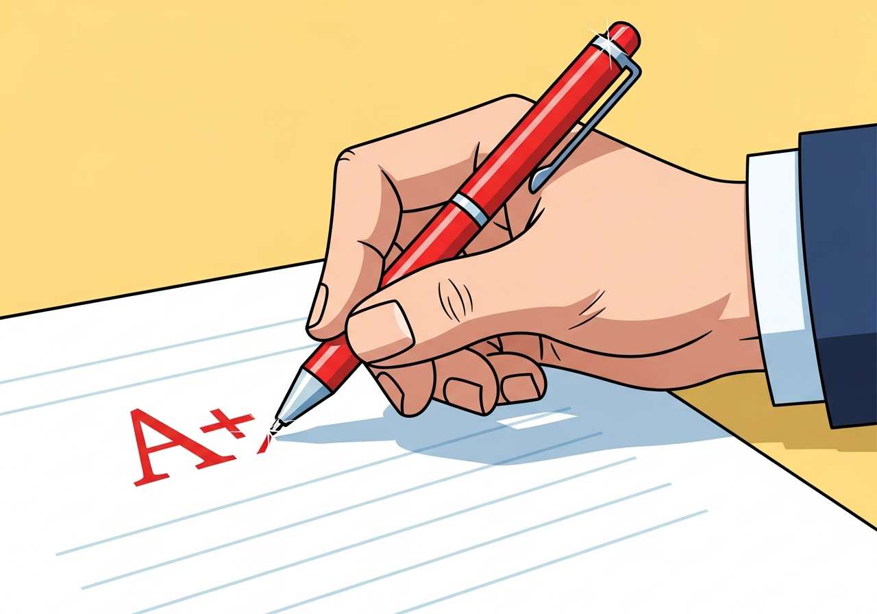 先生は内容と文法に基づいて生徒の作文を等級分けした。