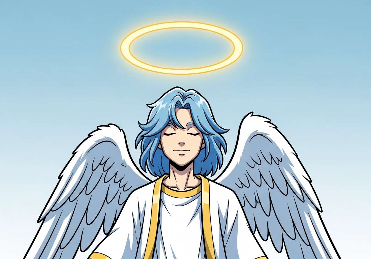 その絵画では、天使の頭上に金色の光輪が描かれている。