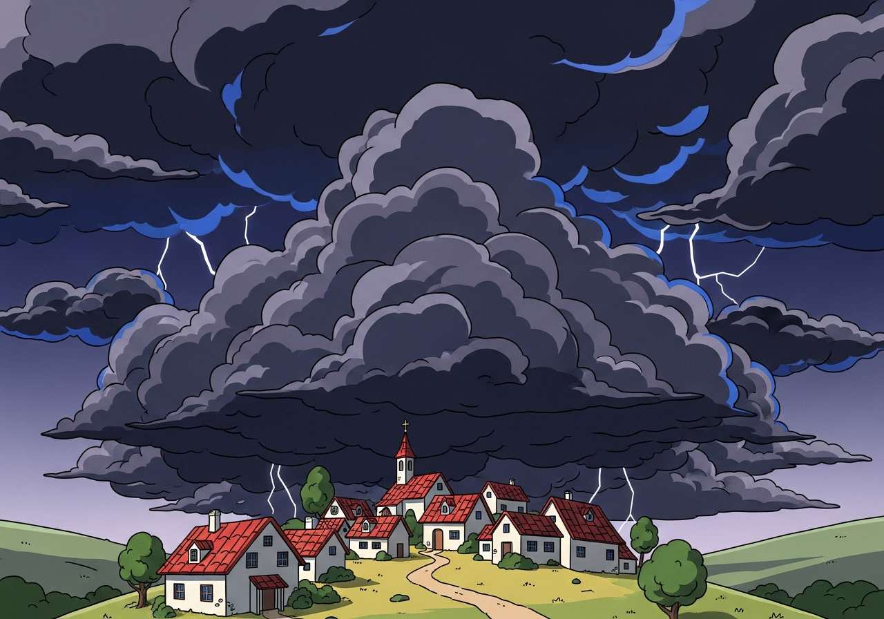 暗い雲が小さな村の上に不気味に覆いかぶさっていた。