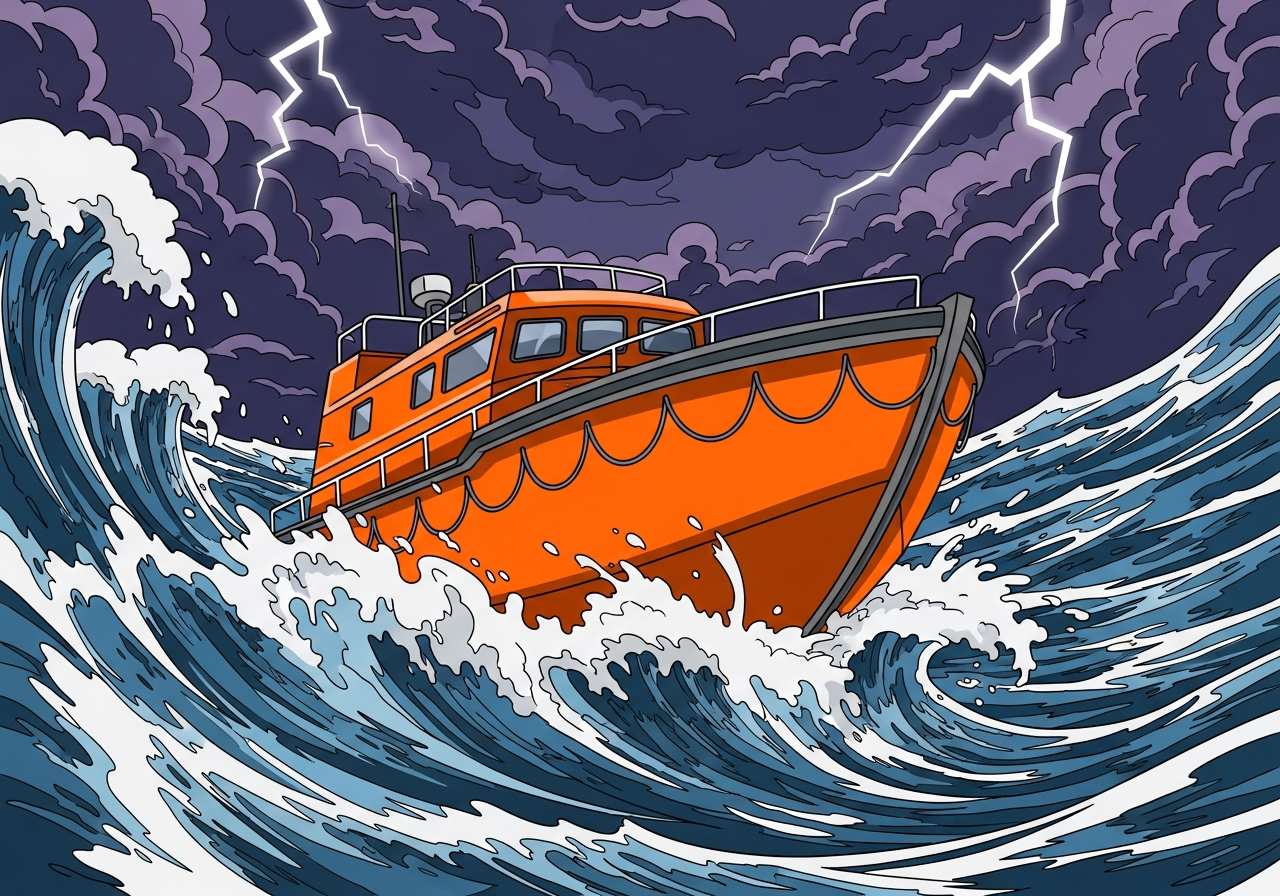 海上で遭難した人々を救助するために設計された小型船。緊急時に使用される救命用のボート。