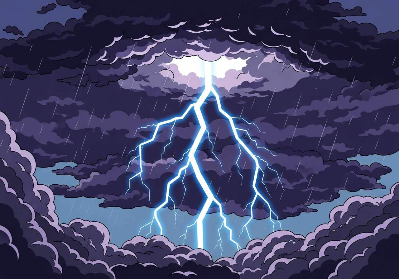 空から地面に向かって放電される明るい光の閃光。雷雨の際に見られる自然現象。