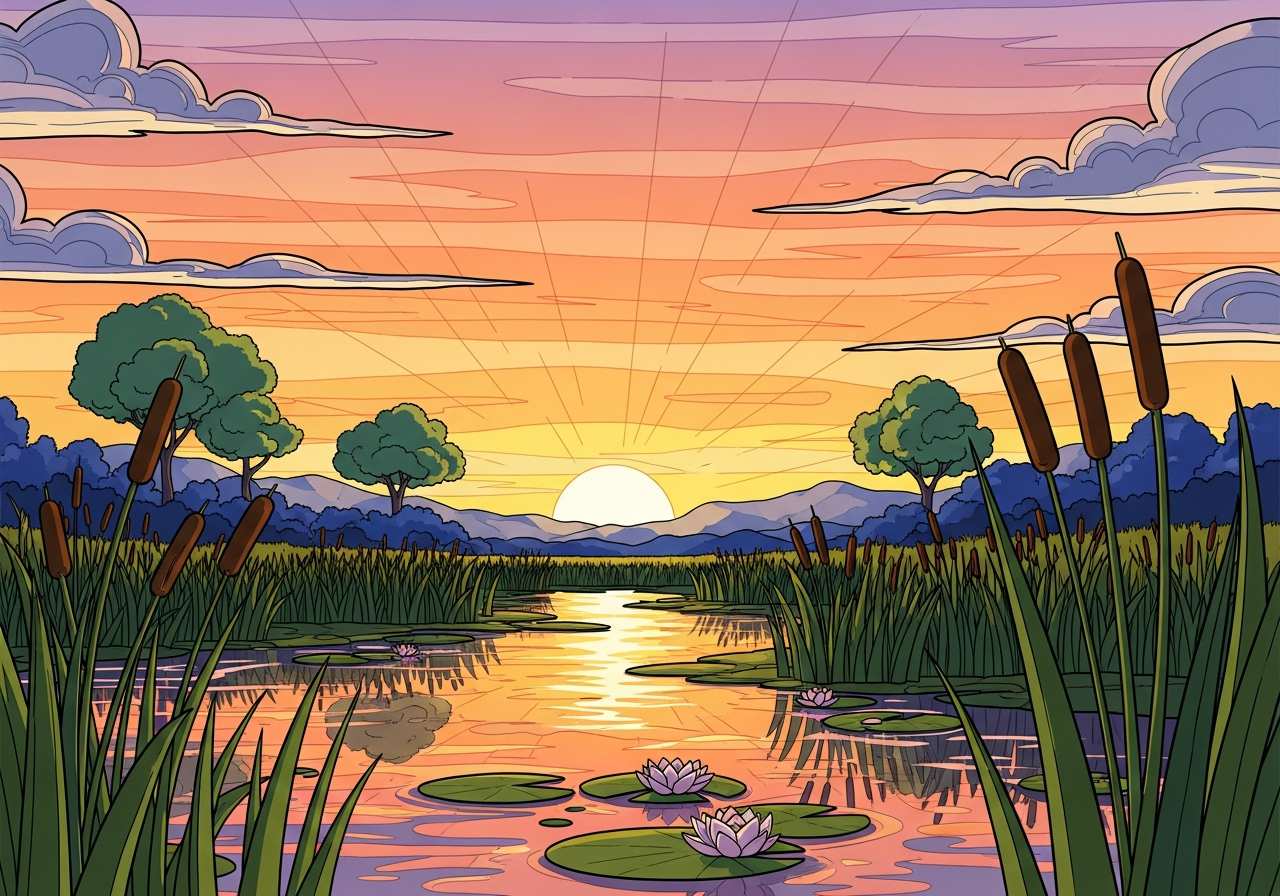 水が溜まり、草や低木が生える湿った低地。沼地や湿地帯を指す。