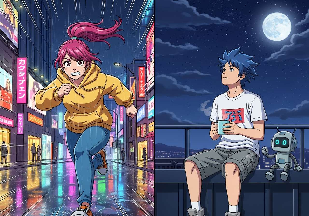 時間的な対比を示す接続詞で、ある出来事が起こっている間に別の出来事が起こることを表します。「その間に」「一方で」という意味で使われます。
