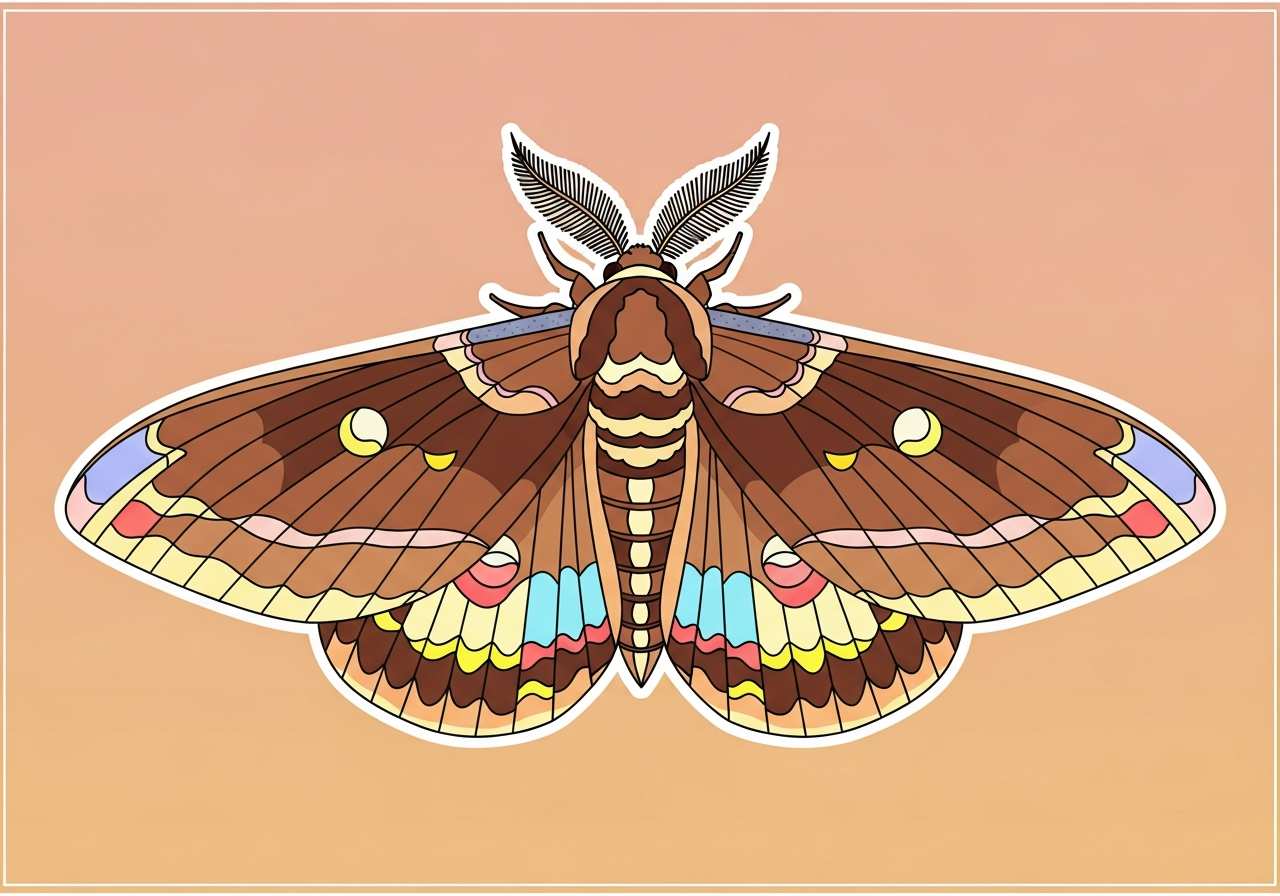 蛾(が)は、主に夜行性の昆虫で、蝶に似ていますが、一般的に地味な色をしており、触角が羽毛状です。