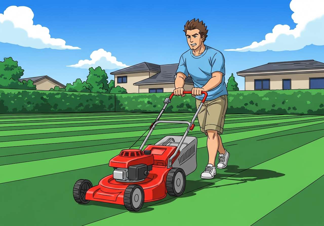 草や芝生を刈る動作を表す動詞。芝刈り機や鎌などを使って植物を切り取ることを意味します。