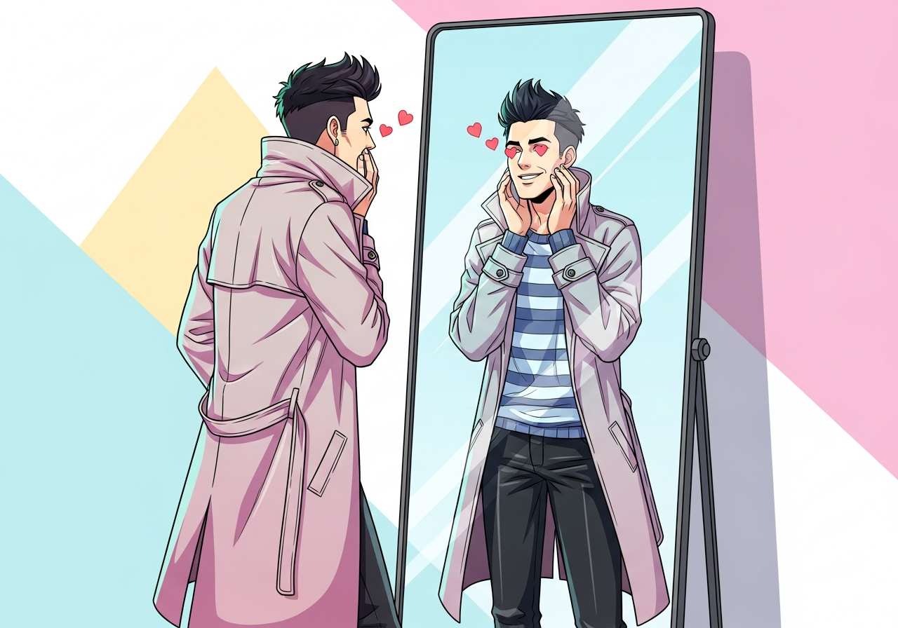 自分自身に過度に夢中になり、自己中心的で、自分の外見や能力を過大評価する傾向を表す形容詞。