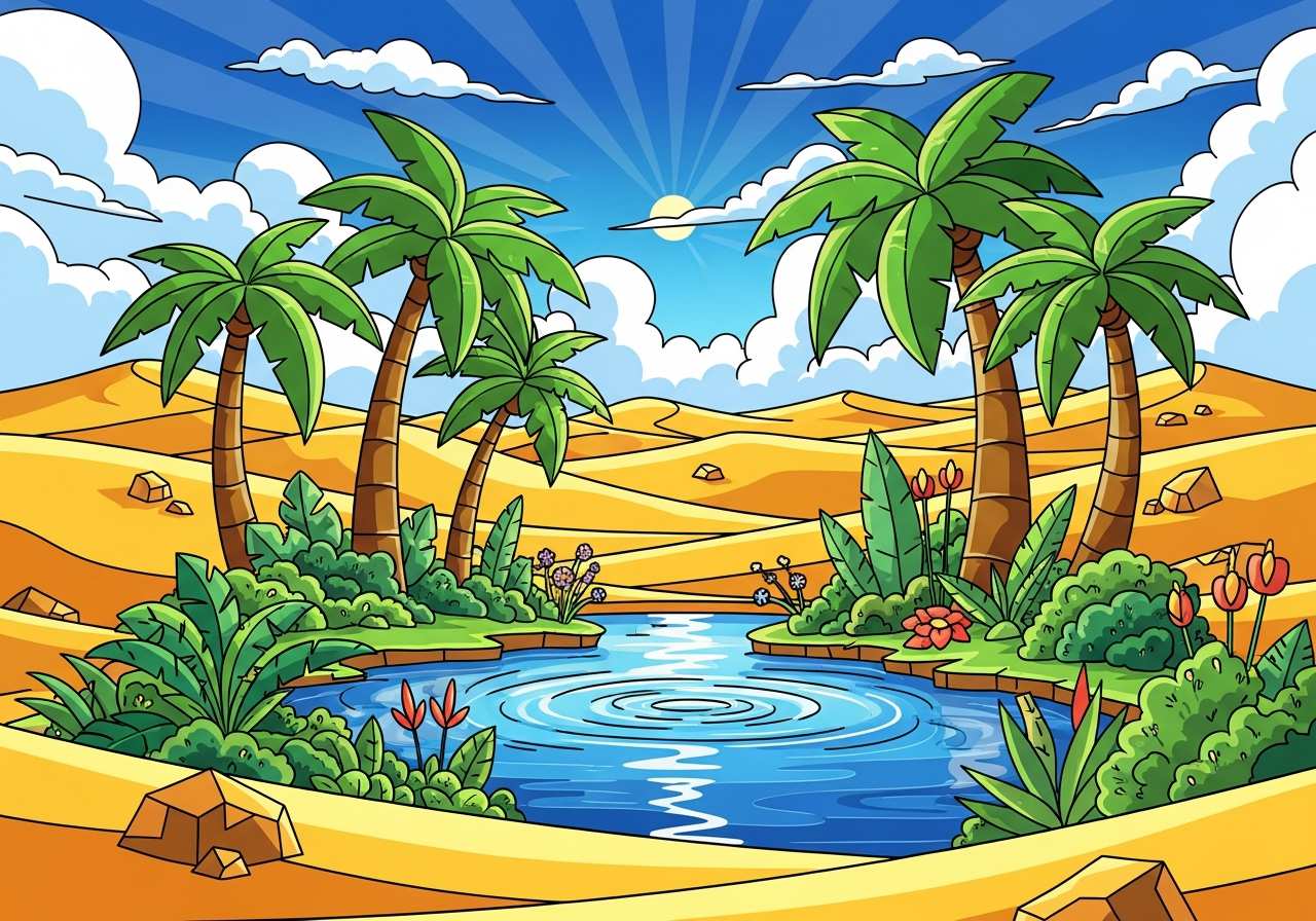 砂漠の中で水や植物が見つかる緑豊かな場所。比喩的に、困難な状況の中での安らぎの場所を指すこともあります。