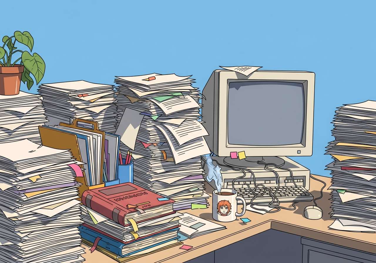書類仕事や事務処理を指す言葉で、特に面倒で時間のかかる書類作成や手続きを表します。