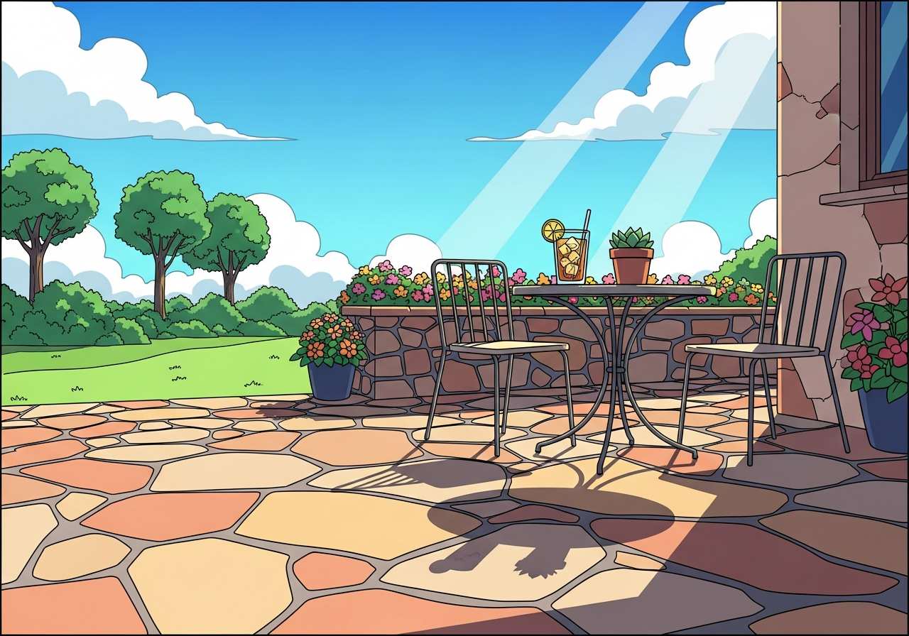 家の外に設けられた、舗装された屋外スペース。食事やくつろぎの場として使われます。