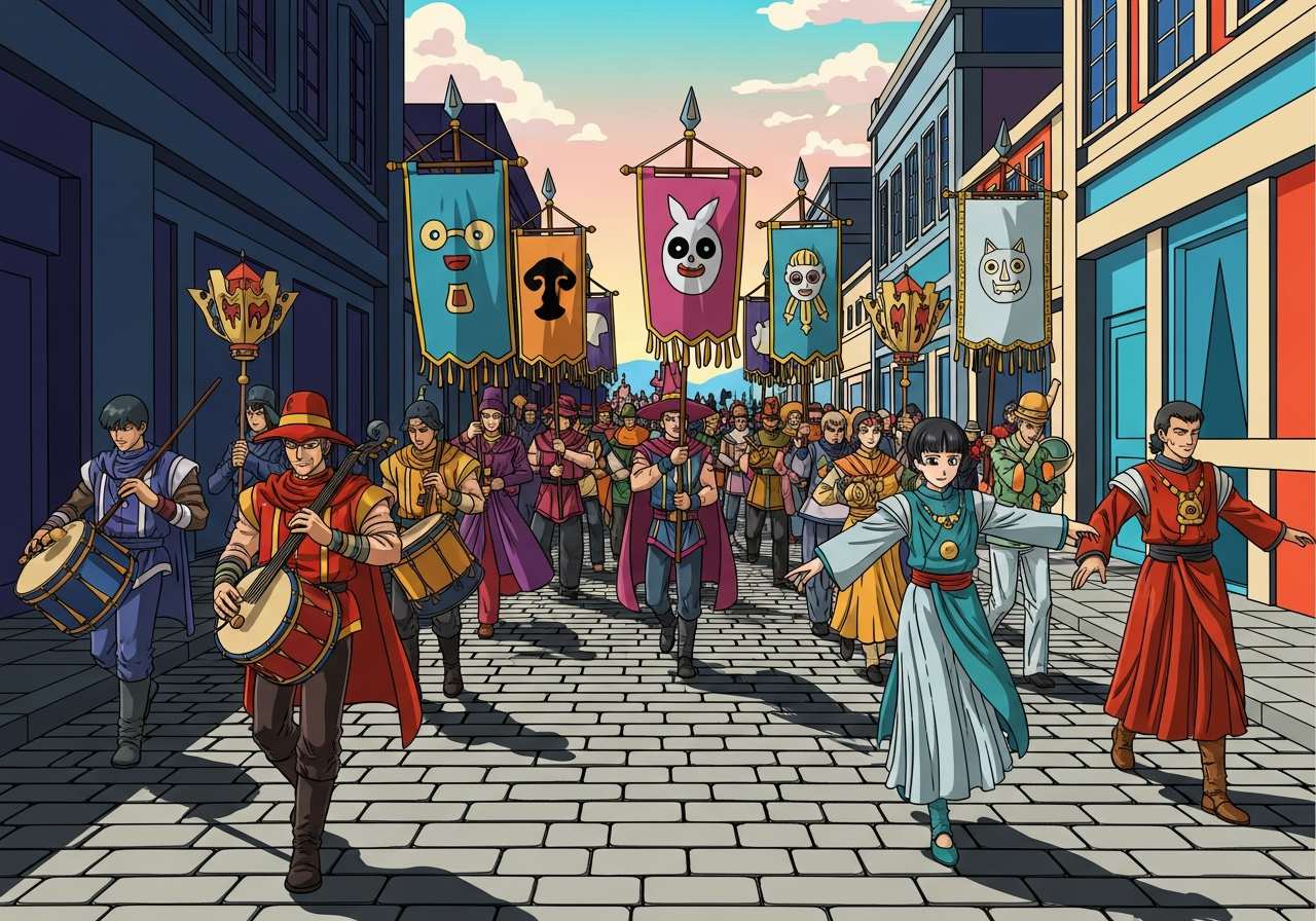 行列や行進を意味し、宗教的な儀式や祝賀イベントで人々が列をなして進む様子を表します。