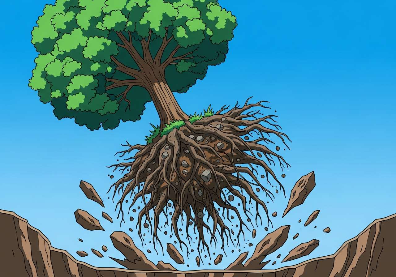 ラテン語の「radicalis」(根を持つ)に由来し、「radix」(根)+ 副詞を形成する接尾辞「-ly」から成る。意味は「根元から」から「根本的に」「極端に」へと発展した。