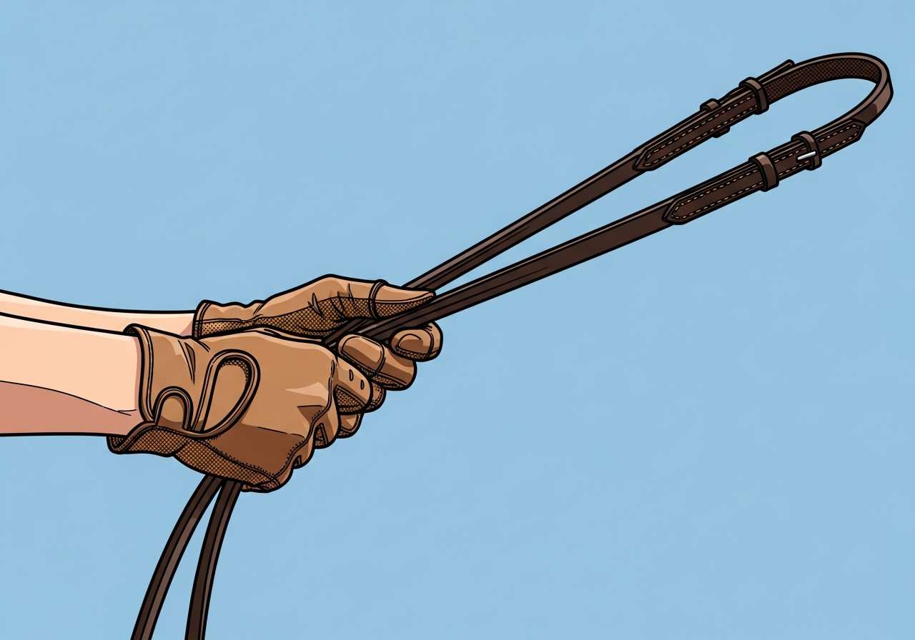 馬を操るために使う革製の紐。比喩的に「制御」や「抑制」の意味でも使われます。