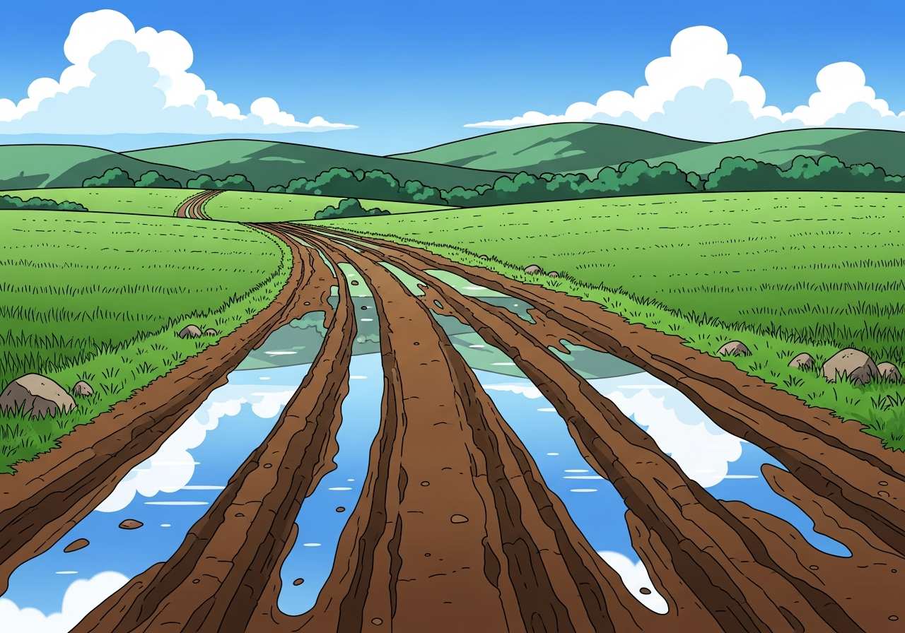 大雨の後、大型トラックが未舗装の道路にわだちを作った。