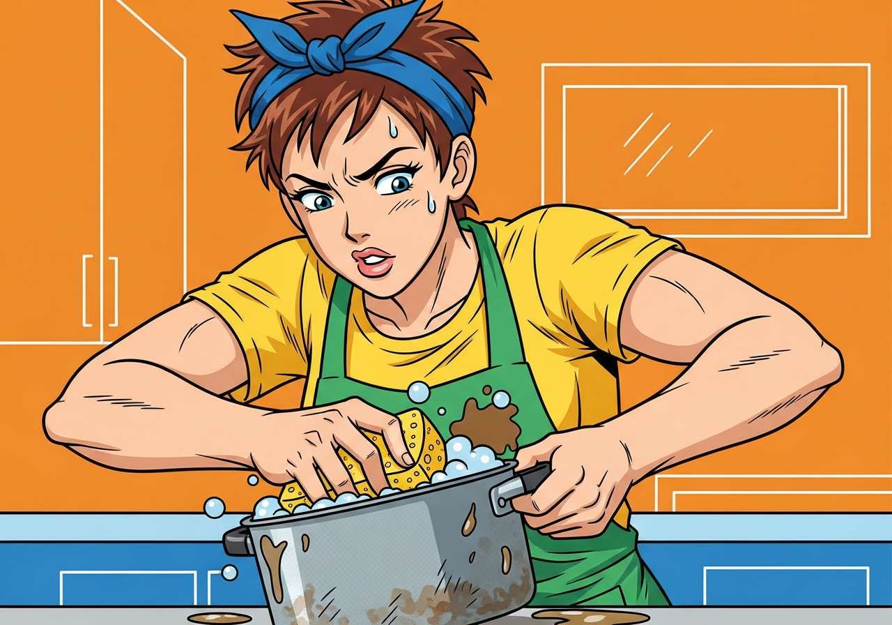彼女はブラシで汚れた鍋をごしごしこすった。