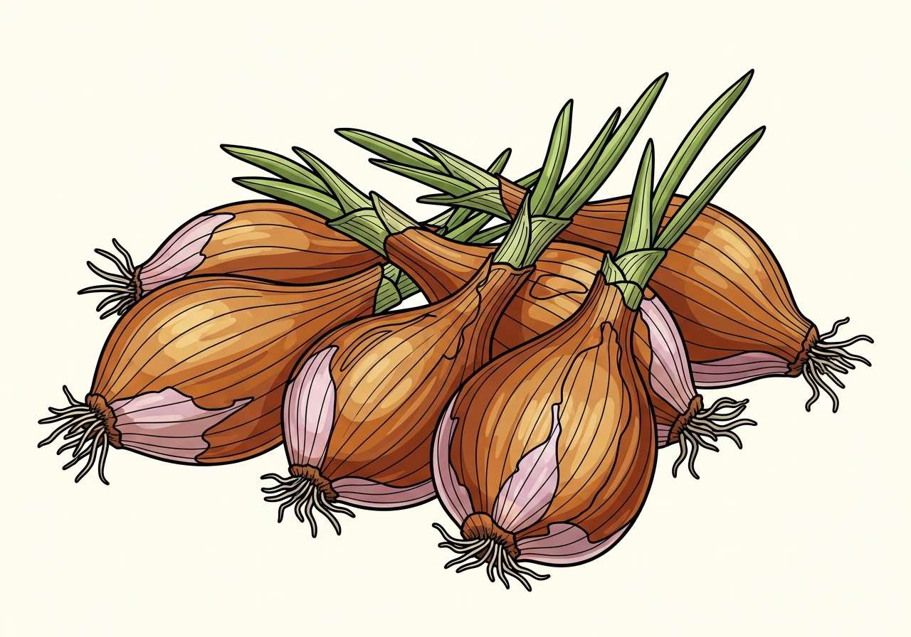 シャロットは、タマネギに似た小型の球根野菜で、マイルドで甘みのある風味が特徴です。料理の香味付けによく使われます。