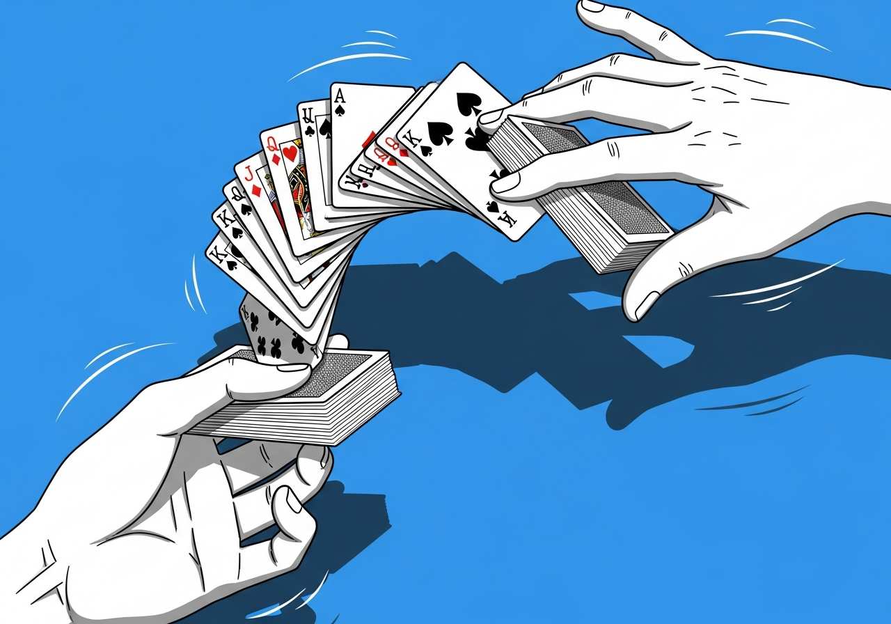 足を引きずって歩く、またはカードなどを混ぜ合わせる動作を表す動詞。