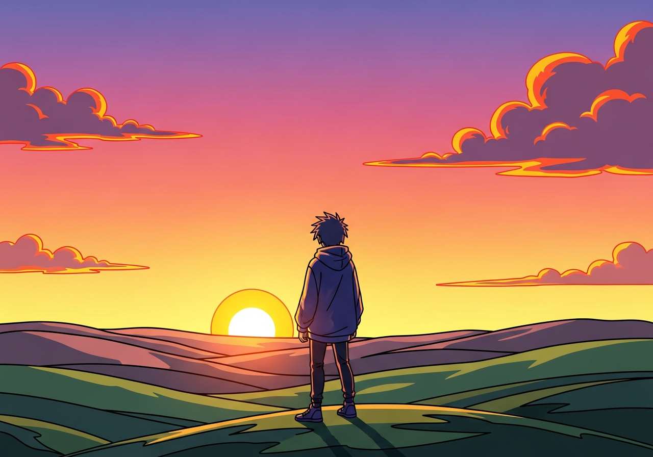 沈む夕日が木々をオレンジ色の空にシルエットとして浮かび上がらせた。